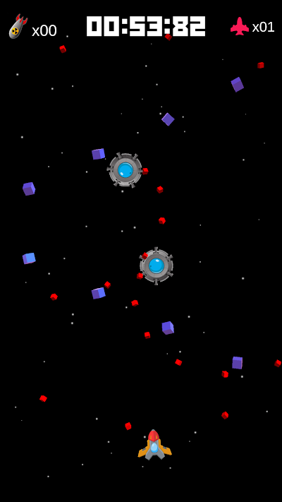 Try to escape from all the enemies and bullets in different shapes and sizes. There are multiple levels of difficulty that increases over time. There are shields and nuke bombs to help you stay alive a bit longer! Sheild will appear shortly, collect to activate it. You gonna have one nuke bomb initially, and more will appear with time. Double tap during gameplay to activate the Nuke.
