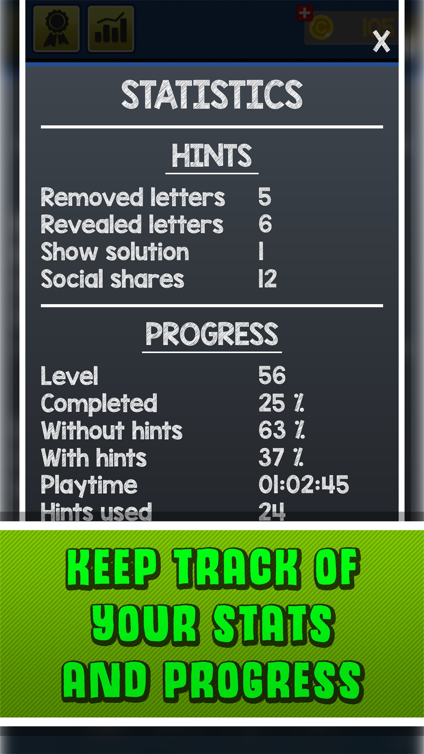 - Keep track of your stats and progress