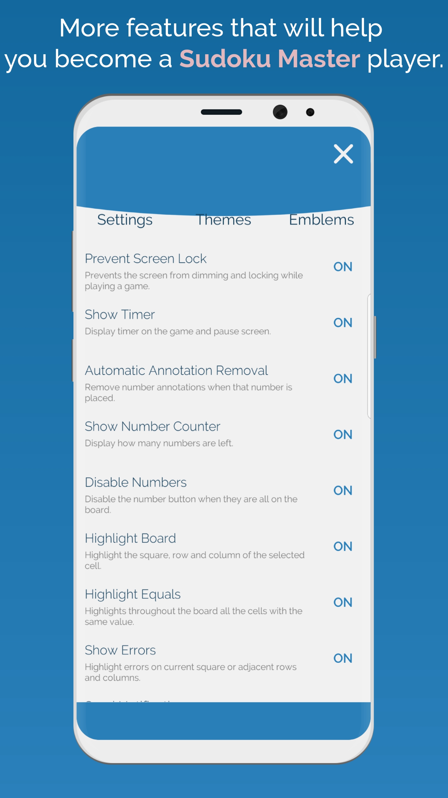 Sudoku Zenkai also features different themes allowing to play on which style you find most comfortable. Tired of numbers? With Sudoku Zenkai emblems you can spice up any Sudoku puzzle with letters, greek, kanji and more.