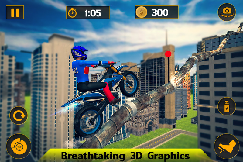 Become a bike stunt rider on rooftop ramps with tricky motorcycle stunt master game. Massive jumps, mid¬-air ramps with variety of paths for extreme stunts! Steer your bike through bizarre routes and dodge deadly obstacles. Stunt bike on wood tracks is a best chance for you to be tricks master in this racing 3d game. Time to perform as a motorcycle racer rider and complete all motor bike stunts missions in best of bike stunt games 2019. You need extreme stunt bike riding skills to drive safely on tricky impossible race tracks and curvy paths. You will feel like you are real smart bike rider on real crazy heights to accomplish impossible stunts racing and driving missions.