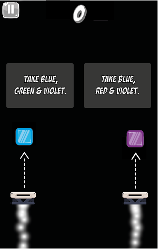 It controls 2 spacecraft at the same time. Each one have to destroy diferentes blocks. The spacecraft at the left side has to destroy the green, blue and violet ones, while the spacecraft the right side have to destroy the blue, red and violet ones. If any of the 2 spacecraft do not destroy the correct blocks, both of them will be destroy too.
