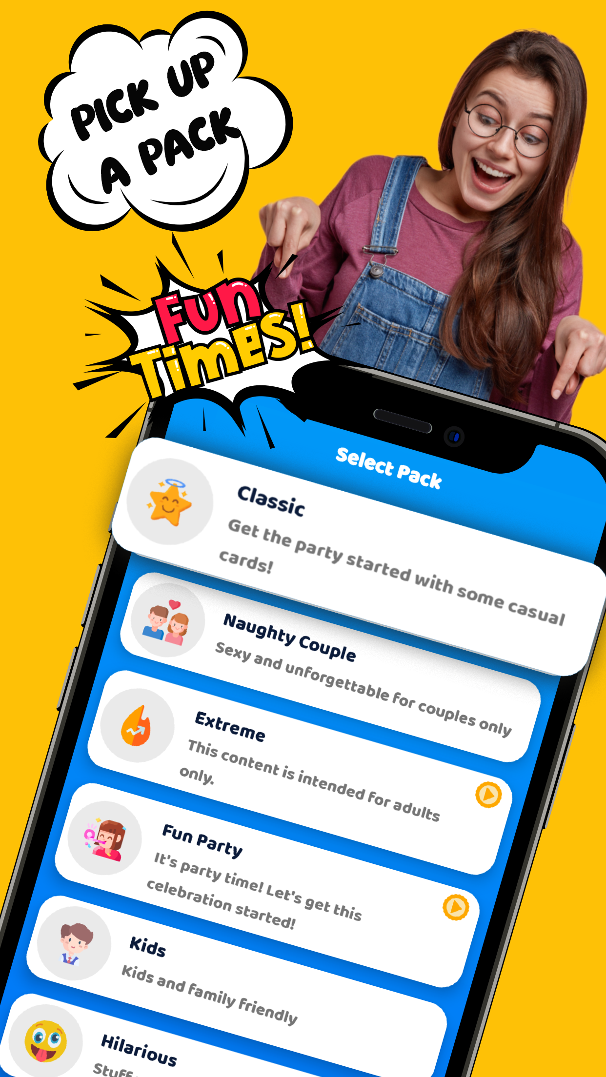The dares are arranged into 6 levels: Classic for the casual truth and dare, Naughty Couple for couples only, Extreme for adults only, Fun Party to start the party, kids for kids and family friends, and Hilarious are for the stuff you shouldn't talk about or do.