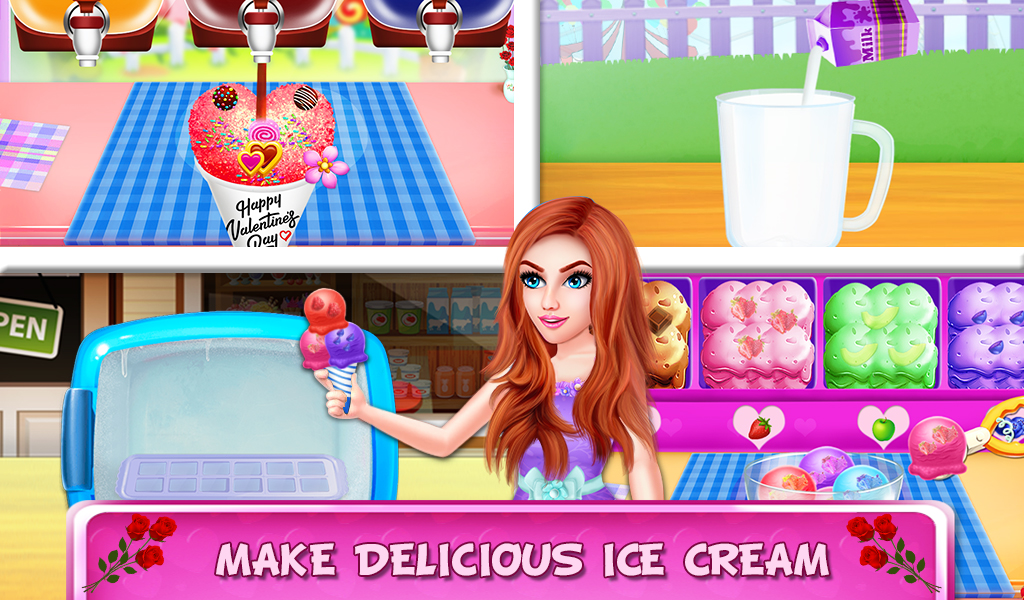 The girl doesn't want to make a simple milkshake. She wants to make it special for the Valentine party. You need some ice, knife, mixture, bowl, milk, ice creams and different toppings and straws. Make a milkshake for the valentine party.