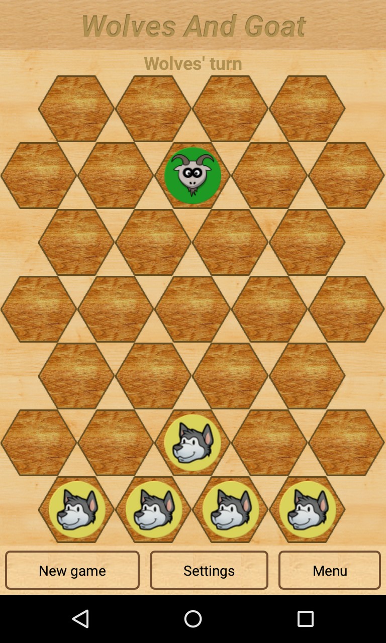 At the beginning, the goat and the wolves are placed on the opposite sides of the board with hexagonal cells.