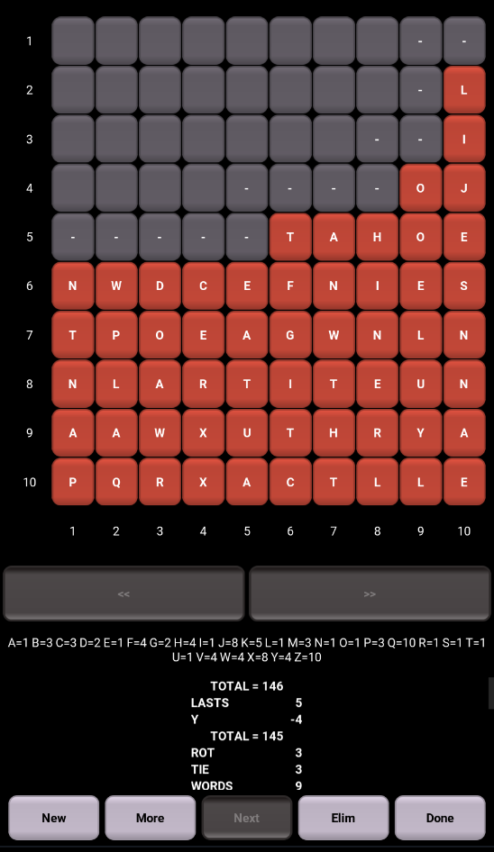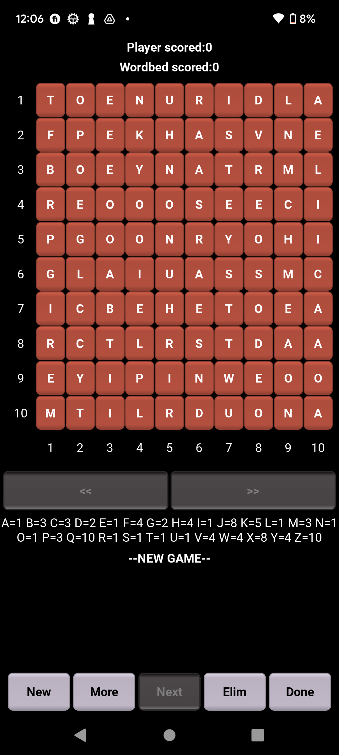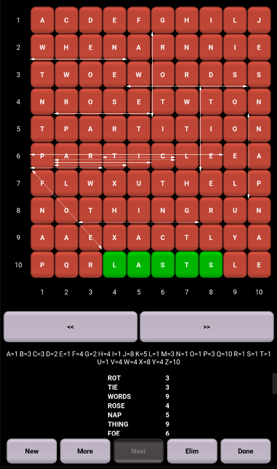 WordBed is a word search game that pits you against WordBed for the highest score. You both play the same game board. You find as many words as you can and then have your words eliminated from the board. The board is then compressed down and you continue playing. When you are done, WordBed gives it a try. But, you have one advantage over Wordbed - you can change letters when it cannot. An array of game sounds confirm every board action taken. Try to BEAT WORDBED and get an audio surprise.
