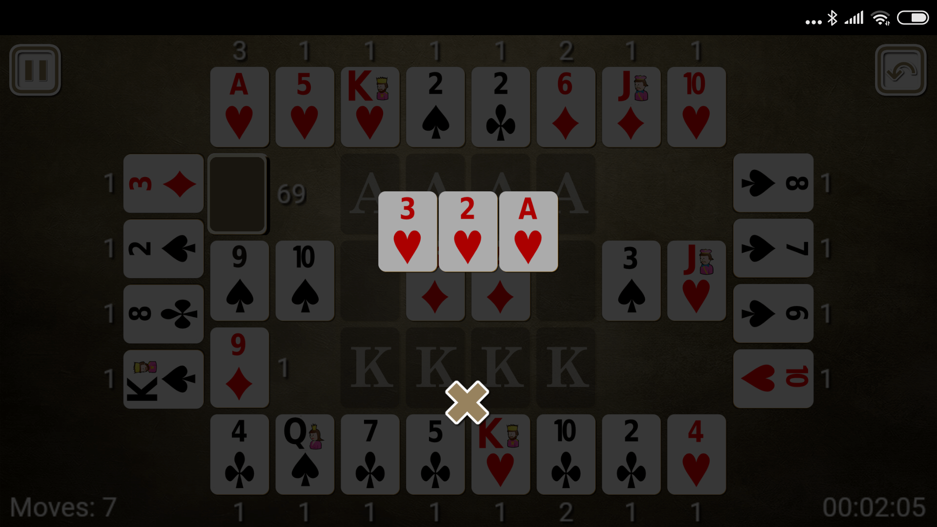 Once all cards from the stock and waste files are moved to the "zodiac" and the "equator", second phase starts. In second phase cards from the "zodiac" and the "equator" are directly build onto the foundation. Cards can not be moved between the zodiac piles or, from a "zodiac" pile to the "equator.