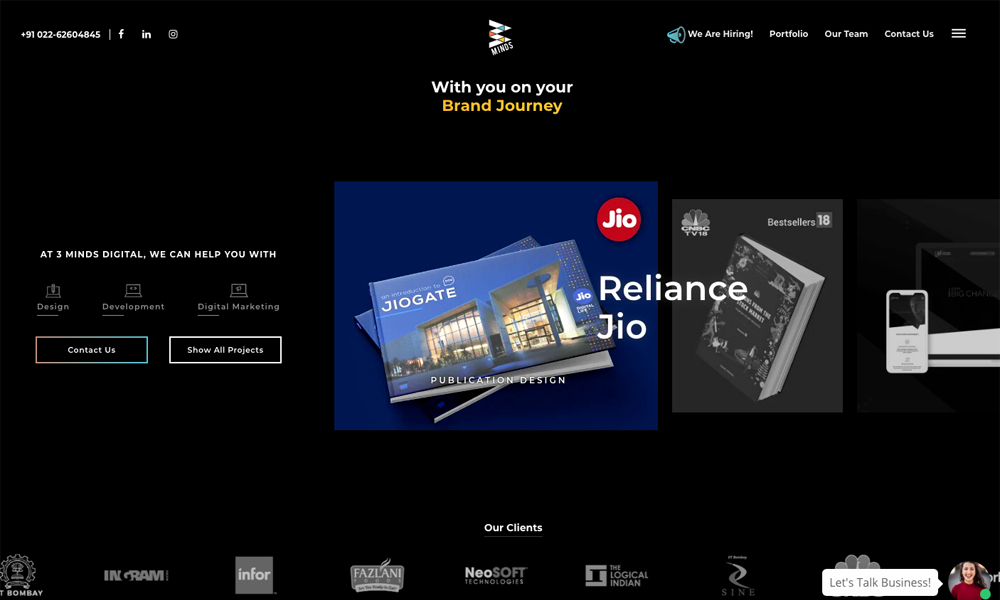 3 Minds Digital is a design and digital marketing agency with offices in Mumbai, Delhi and the UK. At 3 Minds Digital, we combine design, communication, and digitization to help clients go beyond the conventional route. Our approach moves us away from traditional problem solving, which can often be restrictive and limit us to boxed ideas. Hence, we are a one-stop brand solution for client’s needs. 3MD has grown from 3 co-founders, to 50+ employees in a short span of 2.5 years!