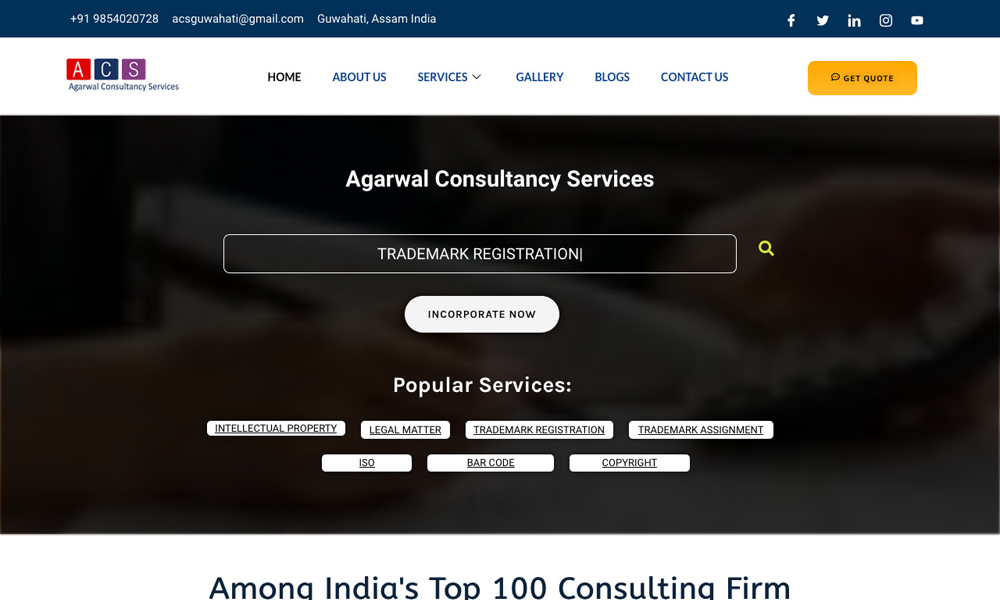 Agarwal Consultancy Services is a professional service firm, which provide services like Intellectual Property, Legal matter, Bar Code & ISO. Within a short span of time we have innumerable clients from startup to well established legal unit. Presently we are the most trusted firm of North East in those fields. We strive better to make ourselves at the top.