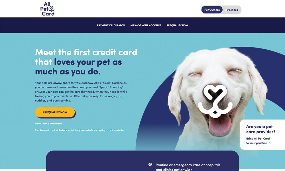 All Pet Card is the first credit card designed exclusively to help pet owners pay for pet care over time. Rather than rely on common financial industry tropes of scare tactics and sad statistics, our team focused on expressing the joy pets bring to people’s lives through fun language and bright colors. Bolstered by the tagline, “Healthy Pets, Happy Wallets,” we delivered tailored messages to walk pet owners and veterinary practices through the process for applying for, using and accepting All Pet Card.