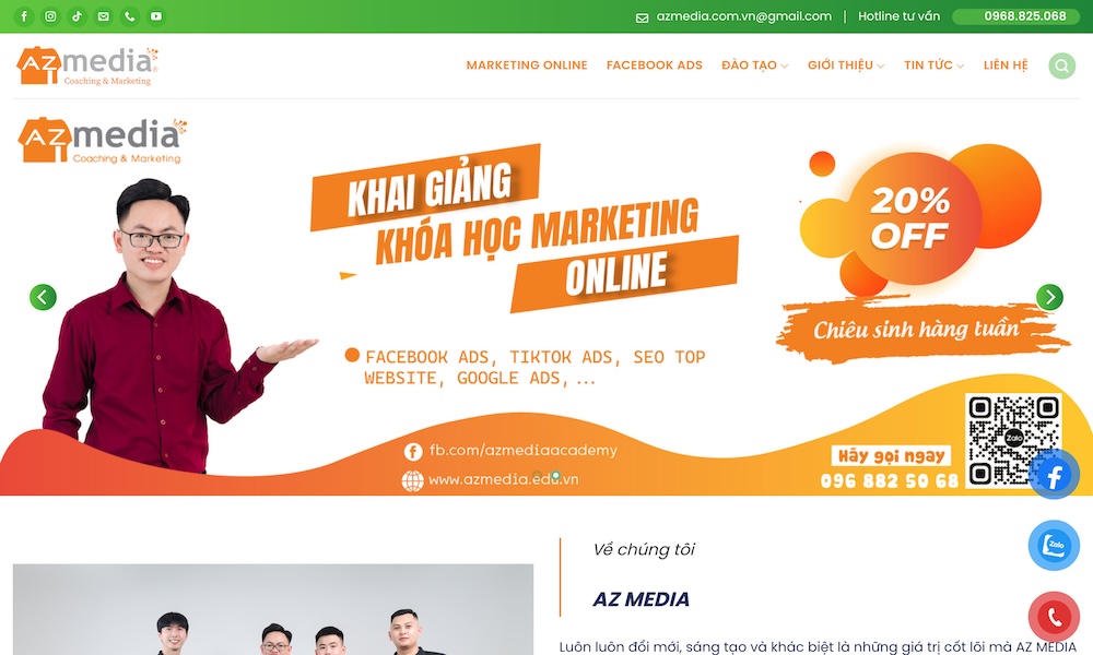 AZ Media là trung tâm đào tạo và cung cấp giải pháp Digital Marketing chuyên sâu tại Đà Nẵng. Với hàng năm kinh nghiệm, họ đã đào tạo hàng ngàn học viên và triển khai nhiều dự án thực tiễn trong lĩnh vực marketing online