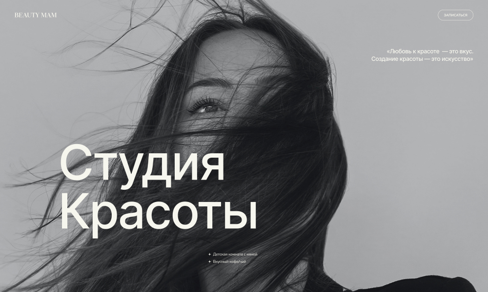Personal website for business. Website for a beauty salon, made in minimalism in order to stand out against other competitors. It was necessary to show all the advantages of the salon, as well as to provide customers with a convenient way to sign up for a service.