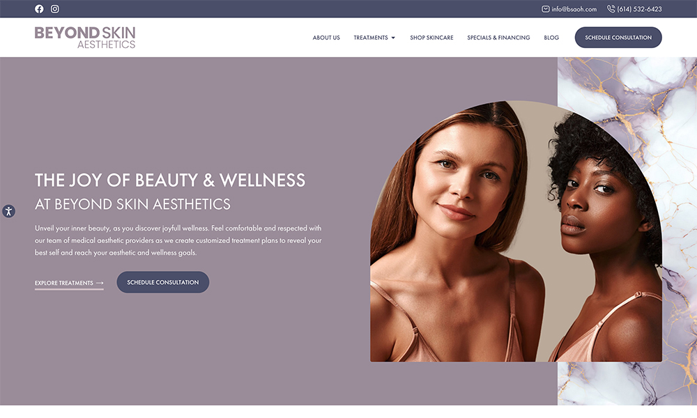 The Beyond Skin Aesthetics website design is a clean, minimal design with an emphasis on SEO content.
