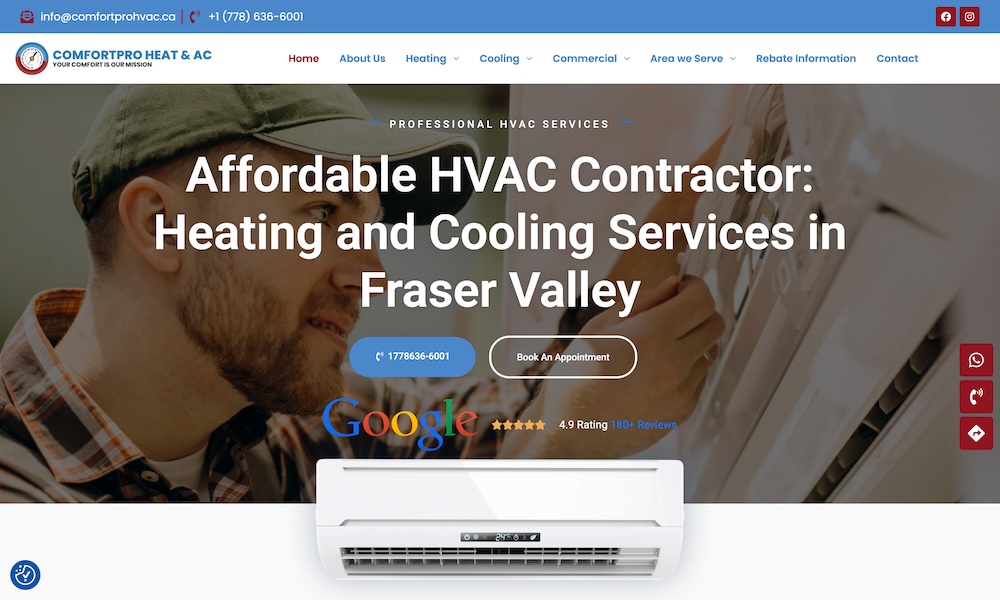 ComfortPro Heat & AC is your trusted HVAC service provider in Vancouver, specializing in heating, ventilation, and air conditioning solutions for residential and commercial properties. We are committed to delivering energy-efficient installations, reliable repairs, and regular maintenance to ensure your comfort throughout the year. Whether you need furnace replacement, AC installation, or indoor air quality improvement, our expert team provides prompt and affordable services tailored to your needs.