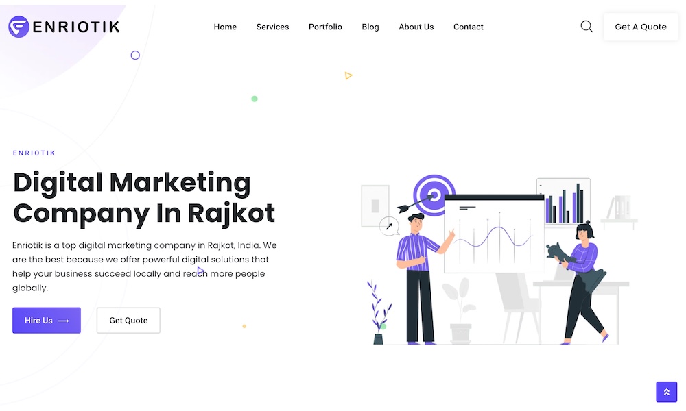 Enriotik is a digital marketing company in India that helps businesses grow online. It works with all kinds of businesses, big or small. Enriotik helps your website show up on Google, runs online ads, manages your social media pages, and creates content to tell people about your business. The main goal is to get more people to see your brand, visit your website, and become customers. Enriotik focuses on getting real results that help your business grow for a long time.