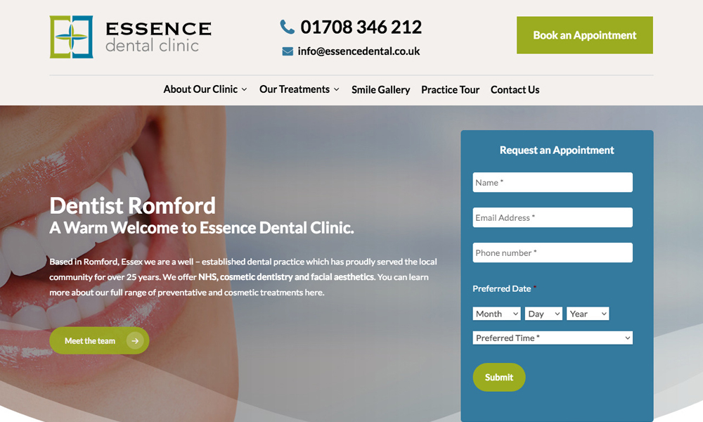 This clean, simple, functional and responsive website was built by UK-based web design agency, Bootcamp Media for Essence Dental Clinic. We opted for a gallery of large, close-up, eye-catching images for the Homepage, which instantly communicate how the services we offer can achieve the outcomes our clients are looking for.