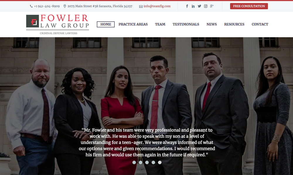 Clean and well-organized site for Sarasota criminal defense attorneys. Nice use of business colors, seriff fonts, and accompanying imagery.