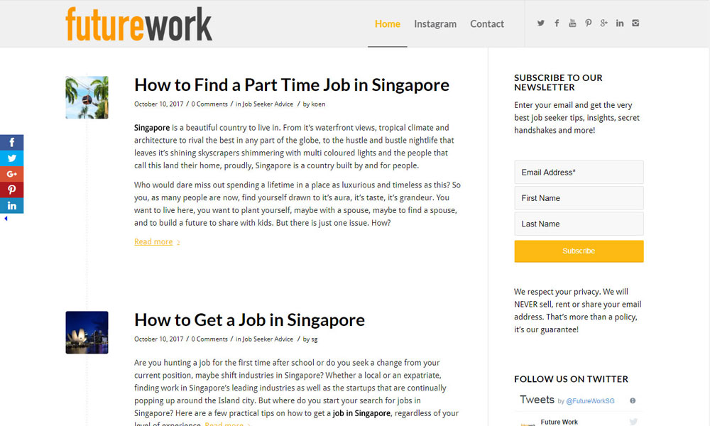 Futurework.life is a content marketing blog primarily used for pre-promotion of a new job market website due to launch in Q1 2018. The secondary aim of Future Work Life is lead capture and third is building a social media following ahead of the big launch.