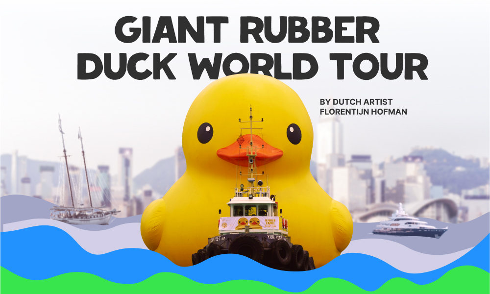 Art project "Yellow Rubber Duck" by dutch artist Florentijn Hofman, which travels all over the world. You can find list of it's locations and other interesting information.