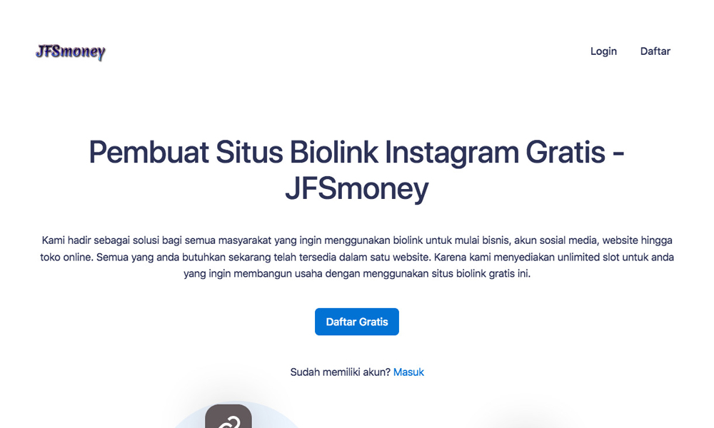 JFSmoney merupakan situs gratis pembuat tautan biolink profile terbaik di Indonesia saat ini. JFSmoney biolink profile sangat cocok untuk anda gunakan dalam mengembangkan bisnis, toko online maupun fanspage anda. Segera miliki tautan biolink porfile jfsmoney secara gratis sekarang juga.