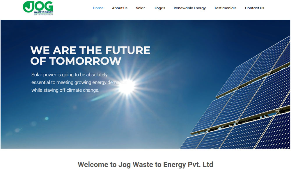 JOG Waste to Energy is a company established by two energetic enthusiastic and young entrepreneurs with a prime objective of providing cost effective innovative products and services, to cater ever emerging needs of the domain, of solar energy and other waste to energy technologies. Committed for development and improvement of solar power generation and other waste to energy technologies so as to provide high efficiency equipment’s, products and services for betterment of our eco-system. Our Team has expertise in design and manufacturing Rooftop Solar Power Plant, Solar Water Heater, Solar Street Light, Biogas Upgrading System, Biogas Purifier, Biogas Purification Plant, Solar Modules, Solar Water Pump and complete solar PV industry.