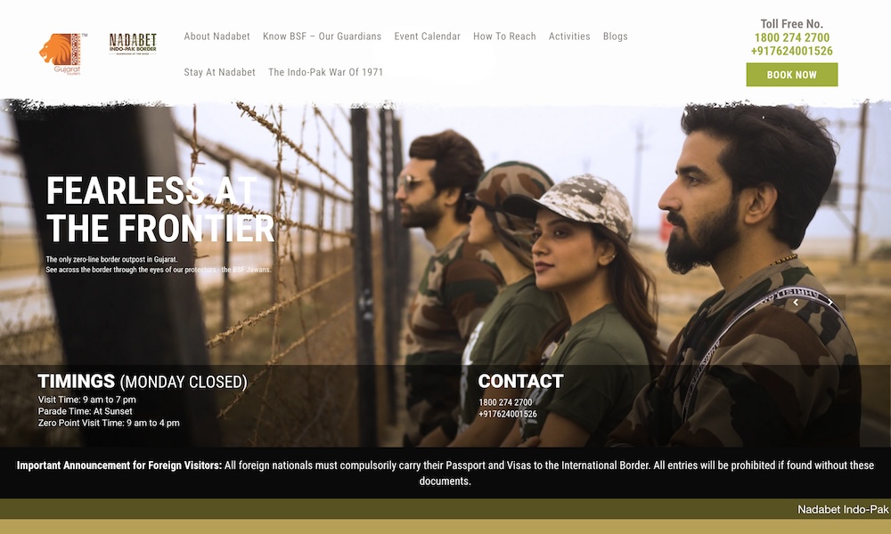Visit the frontline revisit history. Nadabet Seema Darshan is designed to take the visitor on a journey of grit and resilience.Right from the gates to the very Indo-Pak border located 25 km inside, it is an enthralling experience where every visitor entering, will leave a patriot.T-Junction and 0-point offer tourists a wholesome experience along with many other attractions. A high watch tower is specially designed to give the visitors a view across the zero line and several scenic spots.Experience history & adventure at the Nadabet Indo-Pak Border. Engage in thrilling activities, honor BSF Jawans & create cherished memories. Top tourism spot in Gujarat. The Nadabet Indo-Pak Border is a unique destination along the India-Pakistan border which offers visitors a captivating experience that combines history, patriotism, and adventure. At this border tourism destination, you can witness the lives of the Border Security Force (BSF) Jawans and engage in thrilling adventure activities.