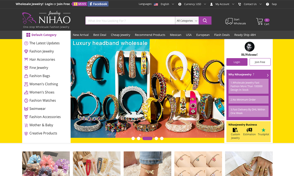 Nihaojewelry is a jewelry wholesale website. The website is mainly based on the pictures of jewelry and accessories products, clearly and concisely showing all kinds of earrings, necklaces, bracelets, etc. to customers. High-quality pictures attract customers to click and place orders.