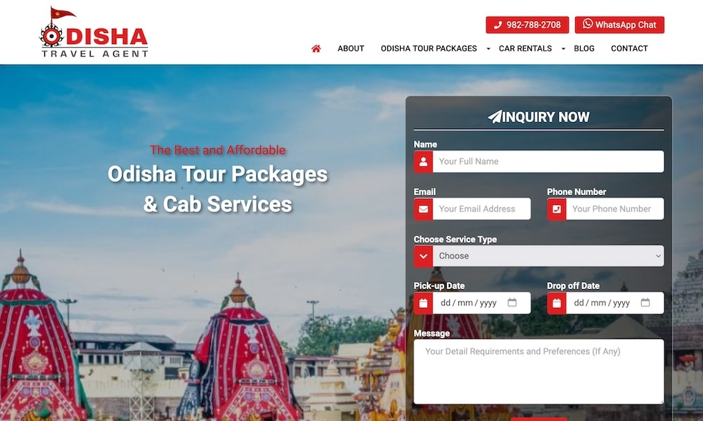Odisha Travel Agent is a reputable travel agency and cab rental company based in Odisha, India. With years of experience in the industry, we specialize in organizing unforgettable tours and providing reliable transportation services. Our dedicated team of travel professionals and courteous chauffeurs ensure that every client's journey is smooth, enjoyable, and memorable. Whether you are a B2B or B2C traveler, we are committed to delivering exceptional service and creating tailored travel experiences that exceed your expectations. Trust Odisha Travel Agent for all your travel needs in Odisha and let us help you explore the beauty and culture of this enchanting region.