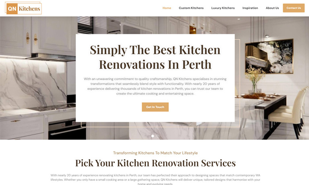 QN Kitchens is a Perth-based kitchen renovation specialist team. The clean, minimalistic layout, paired with a sophisticated color palette of white, gold, and a rich, deep brown, creates an atmosphere of elegance and refinement which matches QN Kitchens devotion to quality and luxury. The website's intuitive navigation and user-friendly interface make it effortless for visitors to explore and discover the information they seek.
