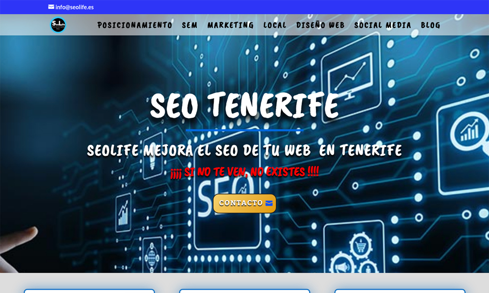 En Seolife somos líderes en Diseño web en Tenerife que te permitirá a incrementar el tráfico a tu web de forma orgánica y mejorar la usabilidad de las páginas de tu Web. Descubre las diferentes posibilidades de diseño para mejorar las ventas de tu negocio online. Trabajamos mayormente con los principales sistemas CMS: Wordpress, Prestashop, Woocommerce, Magento Nuestro equipo de expertos en Diseño web y Marketing digital en Tenerife trabajarán en tu idea de forma integral para conseguir los mejores resultados y alcanzar los objetivos. También somos especialistas en SEO local si quieres aumentar tu visibilidad en Tenerife.