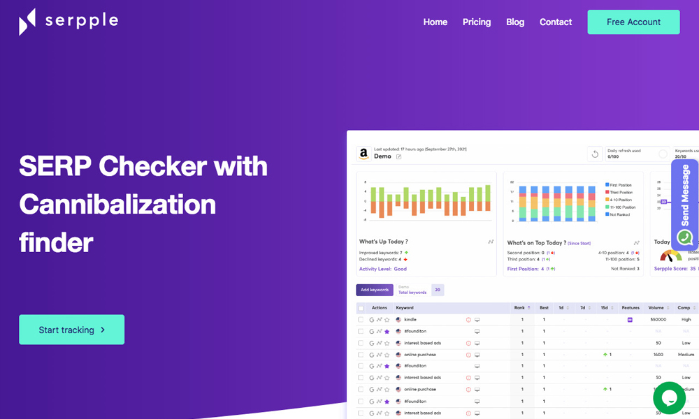 SERPPLE is an eminent ranking tool that will provide you with 100% accurate ranking data of your website's targeted keywords. In addition to this, the tool should also let you track the fluctuations in the ranking positions, send you instant reports on the changes in the keywords, track the ads of your competitors, identify keyword cannibalization, etc.