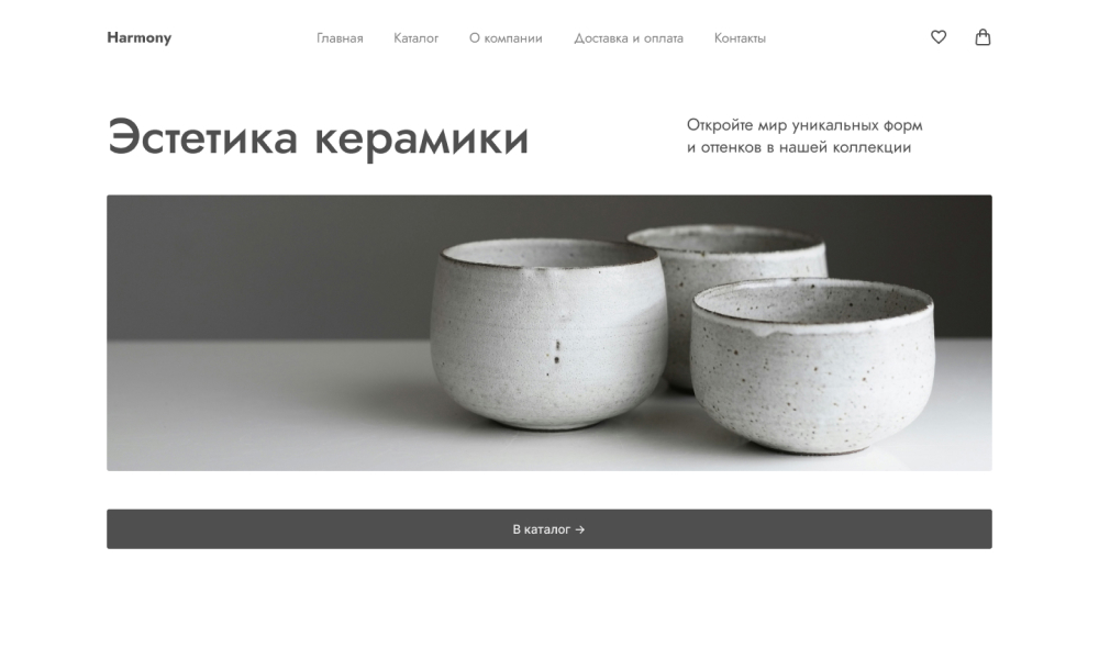 Online store handmade ceramic dishes in minimalistic style. Webstore includes 5 pages and catalogue.