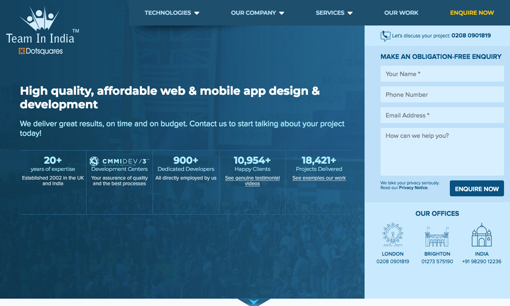 Team in India is the best web development company in the UK with CMMI level 3 appraised with 10K+ clients over the last 20 years. We provide professional web design, development, and marketing services with 100% client satisfaction.