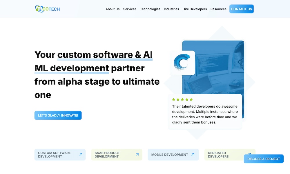 TRooTech Business Solutions is the hub of 400+ tech minds available with the best custom software development solution for all your business requirements. With the aim to provide the most suitable and innovative technical solutions, we follow the latest technological trends and use the technology for all technical requirements. Our expertise in Machine Learning, Blockchain technology, IoT, AR/VR, Automation, and many more empowers us to deliver exceptional technological solutions.