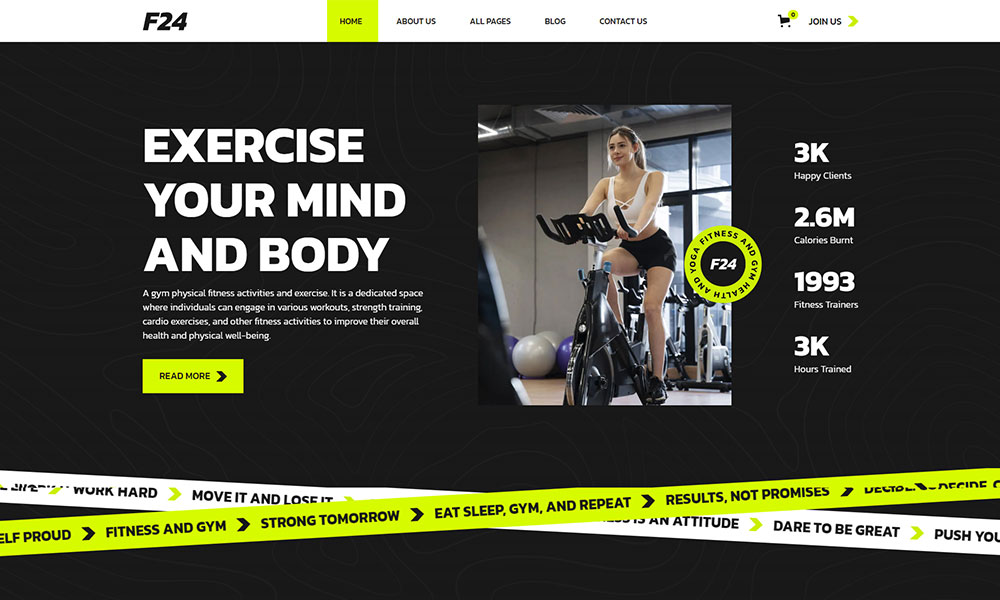 Stylish responsive website template for gyms. Great to showcase sports classes and to present your club or gym. Also, write blog posts and present your trainers using the CMS features.