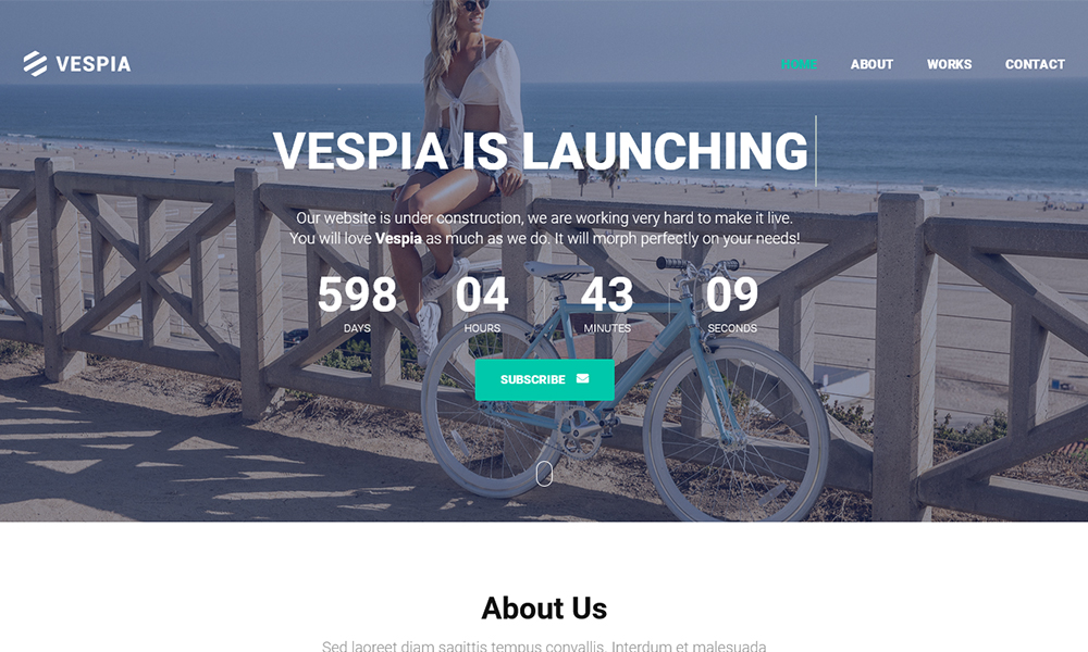 Vespia is a creative and professional coming soon WordPress Plugin built with Bootstrap framework. It includes Ajax MailChimp subscription, Contact Form and Google Maps.